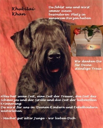 Mit ihm erzielten wir viele Erfolge in Zucht und Ausstellungen. In all seinen Nachkommen, wie im Zwinger vom Schlössleswald, Kennel Riesenspass, vom Kaiser Friedrich Turm, vom Cranger Tor, von der Nollenburg, vom Ottermeer, vom Elfenpütz, vom Käpfle, von der Taverne, vom Hedberg, aus den Welzer Alpen u.a. lebt er für uns weiter.